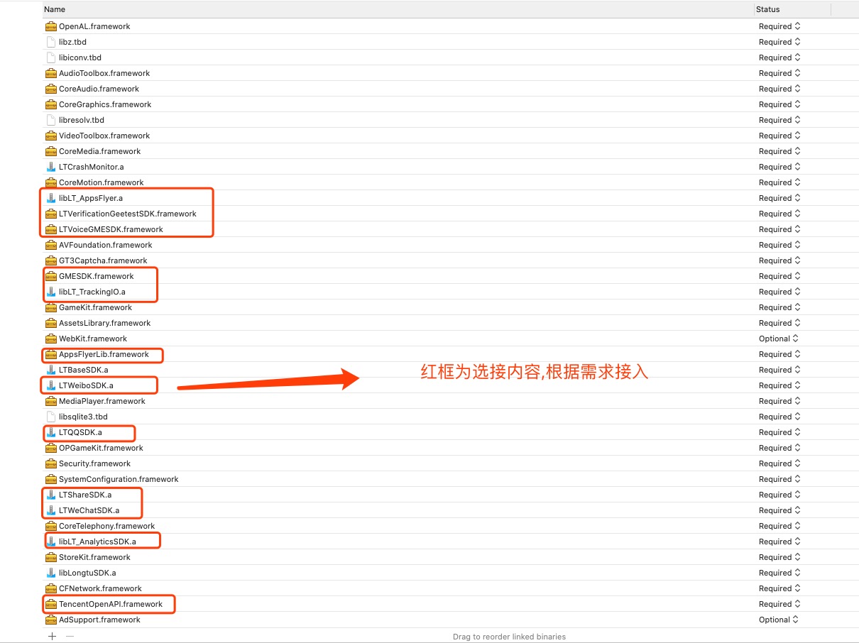 请注意Optional的库,除龙图SDK可选内容外,下图中所有内容都需要添加