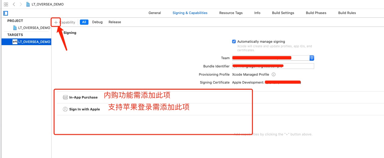 开启内购和苹果登录前提需要苹果证书设置支持.之后再Xcode进行如下设置.
