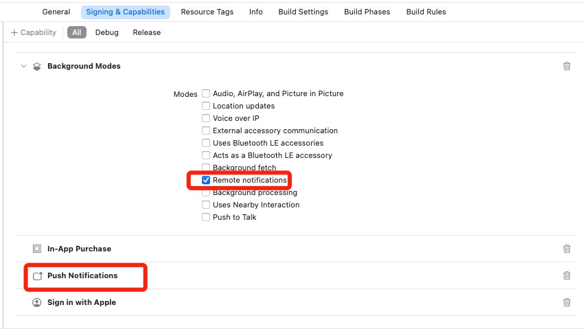 3、设置SDK所需权限, 在项目工程的 signing&capabilities 中增加权限: